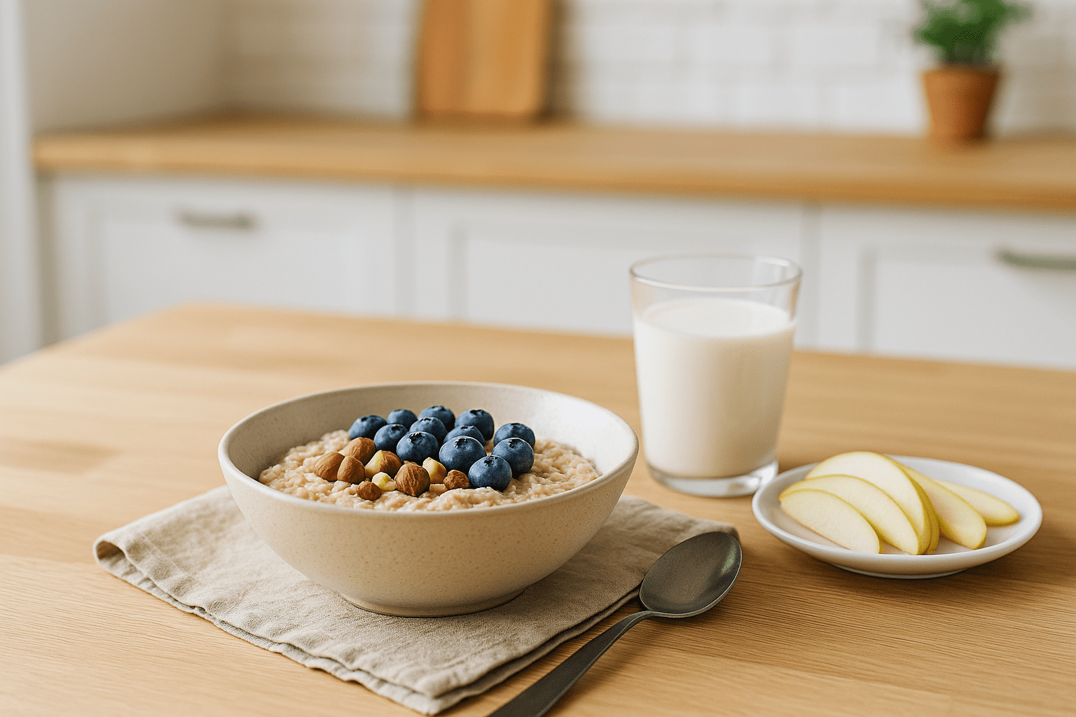 - Owsianka na napoju roślinnym/jogurcie naturalnym + garść jagód + łyżka siemienia lnianego.