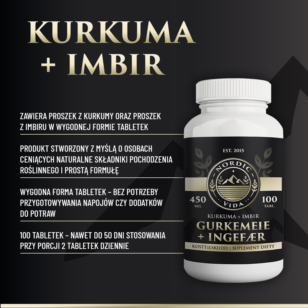 Kurkuma + Imbir Nordic Vida to suplement diety zawierający proszek z kurkumy oraz proszek z imbiru. Produkt został opracowany jako element codziennej diety, oparty na surowcach pochodzenia roślinnego.
