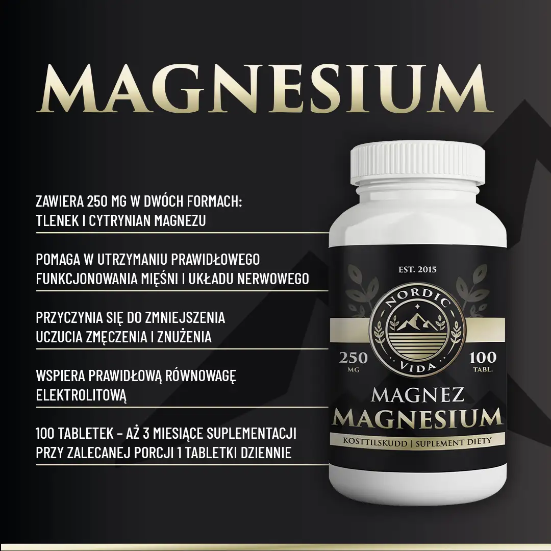 Magnez Nordic Vida to suplement diety zawierający magnez w dwóch formach: cytrynianu magnezu oraz tlenku magnezu. Produkt został opracowany jako element codziennej diety, przeznaczony do uzupełniania magnezu.