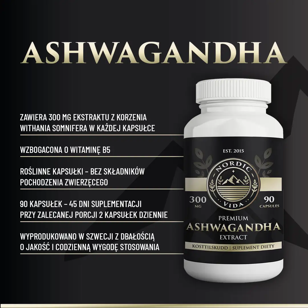 Ashwagandha: Ekstrakt z korzenia Withania somnifera, kwas pantotenowy (witamina B5), kapsułka roślinna (celuloza).