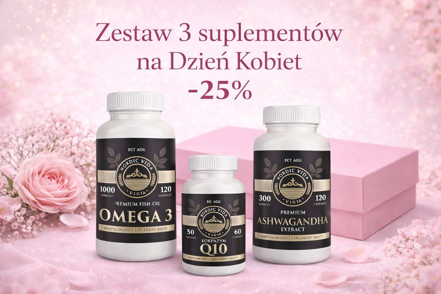 Zestaw Nordic Vida to połączenie trzech suplementów diety: Ashwagandha, Omega 3 Premium Fish Oil oraz Koenzym Q10. Produkty przeznaczone są do codziennego uzupełniania diety w ekstrakt z korzenia Withania somnifera, kwasy tłuszczowe omega-3 (EPA i DHA) oraz koenzym Q10.