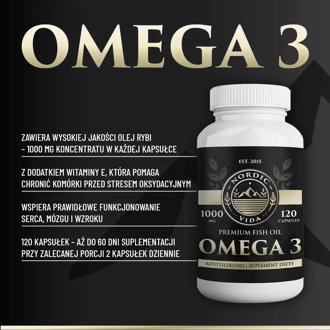 Omega 3 Premium: EPA 360 mg, DHA 240 mg, witamina E 6,7 mg (porcja dzienna – 2 kapsułki). Opakowanie: 120 kapsułek (60 dni).